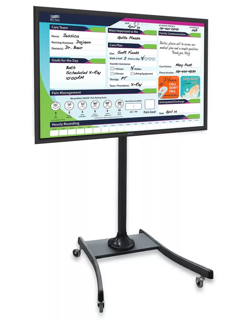 Enjoy all the features of our Original Patented White Boards – on Wheels! Simply change out any of the whiteboard components – from full color graphic inserts to dry erase lenses – without investing in a new board. Keep up with evolving policies and multilingual patient communication with this cost-effective solution.